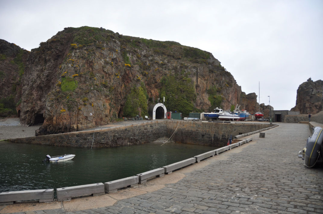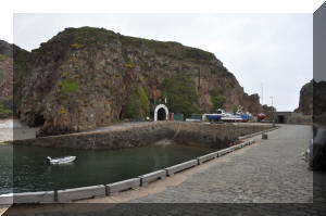 we sailed South to Sark, getting the tide right this time. The harbour on Sark was built in 1595, and can be accessed from the island only through a tunnel cut in the cliffs. The original tunnel is on the left, and a more modern one has a white arched entrance. The harbour is close to dry at low tide, and is not well sheltered, so we did not use it. |