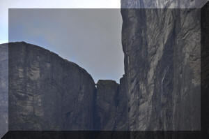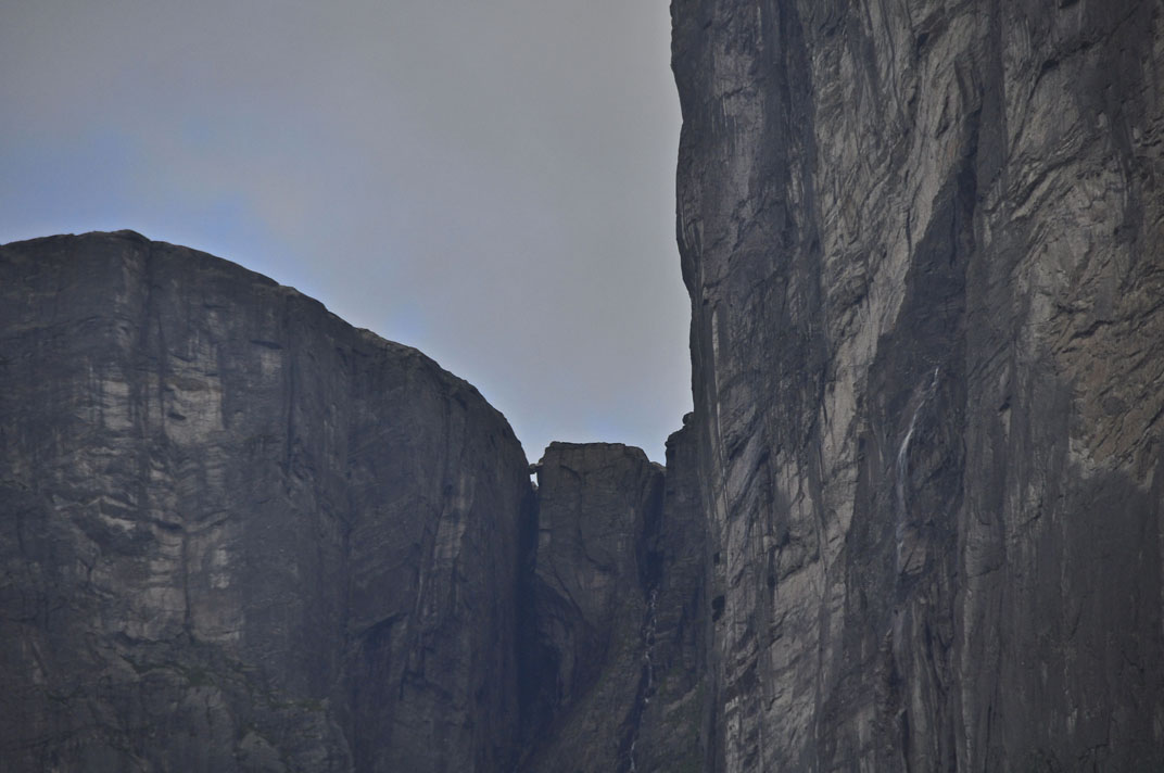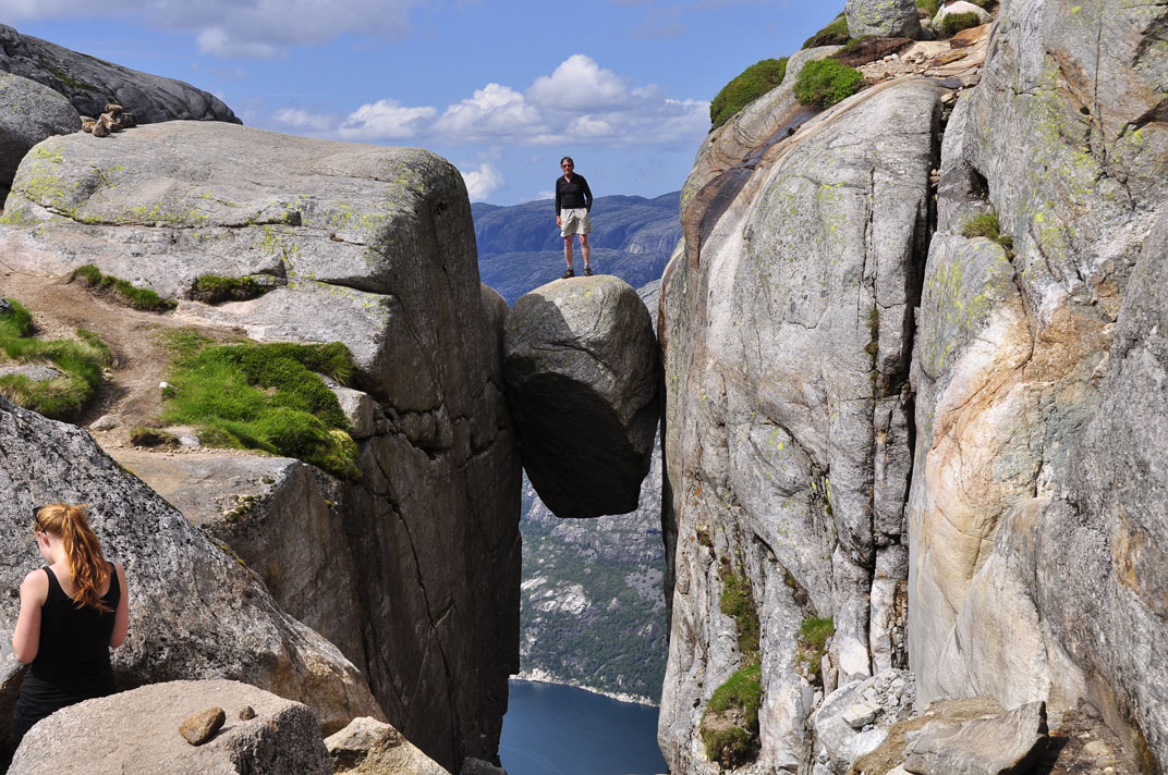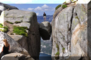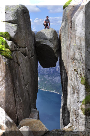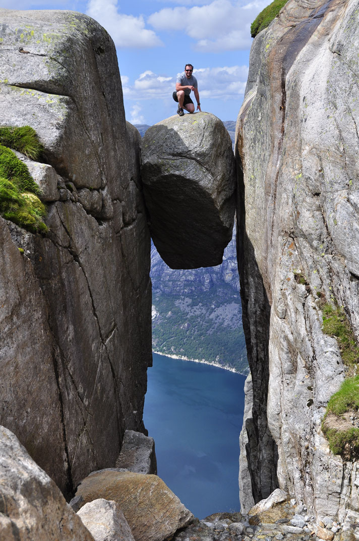 Michael and Neil both climbed on top of it, as did about half the many people who hiked up to it on the day we visited. It is about a 4 hour round trip from the highway, and close to some favourite exits off spots for the BASE jumpers who consider Kjerag one of the prime spots in the world. We went to watch some of them leap and fly. |