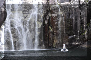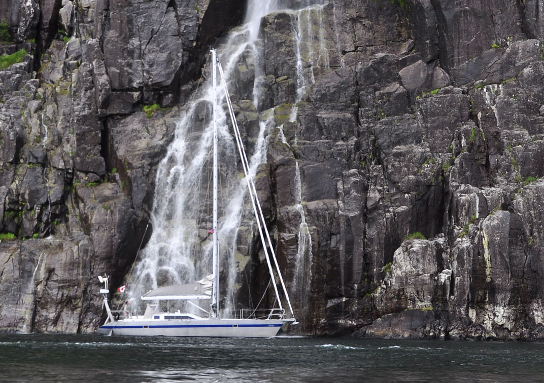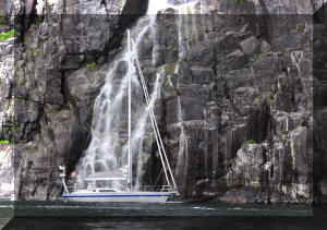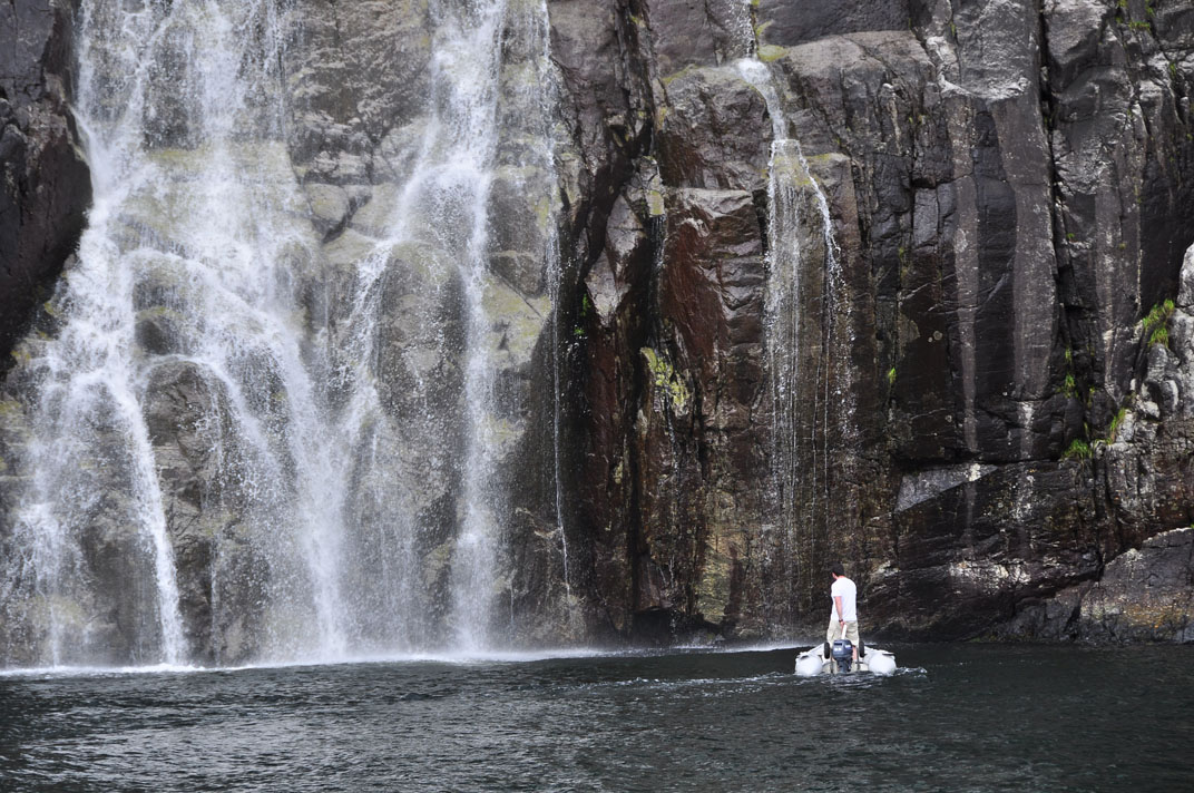 It is easy to approach most of the numerous waterfalls in the fjords, both in Milvina and by dinghy, as Michael is demonstrating here. |