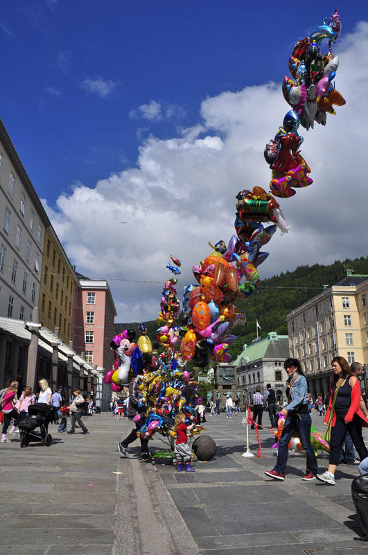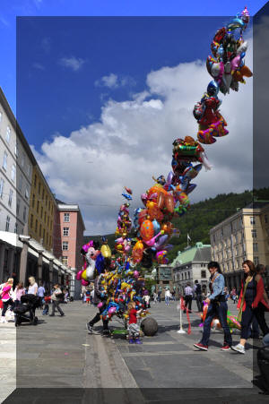 We saw a LOT more parties than fish. . ![]() Balloon sellers in the street were particularly ambitious. We hope he sold the lot, or has a very big van to take the excess home. After the bustle of Bergen, we found a quieter anchorage at Kalsundet, about 20 miles away |