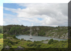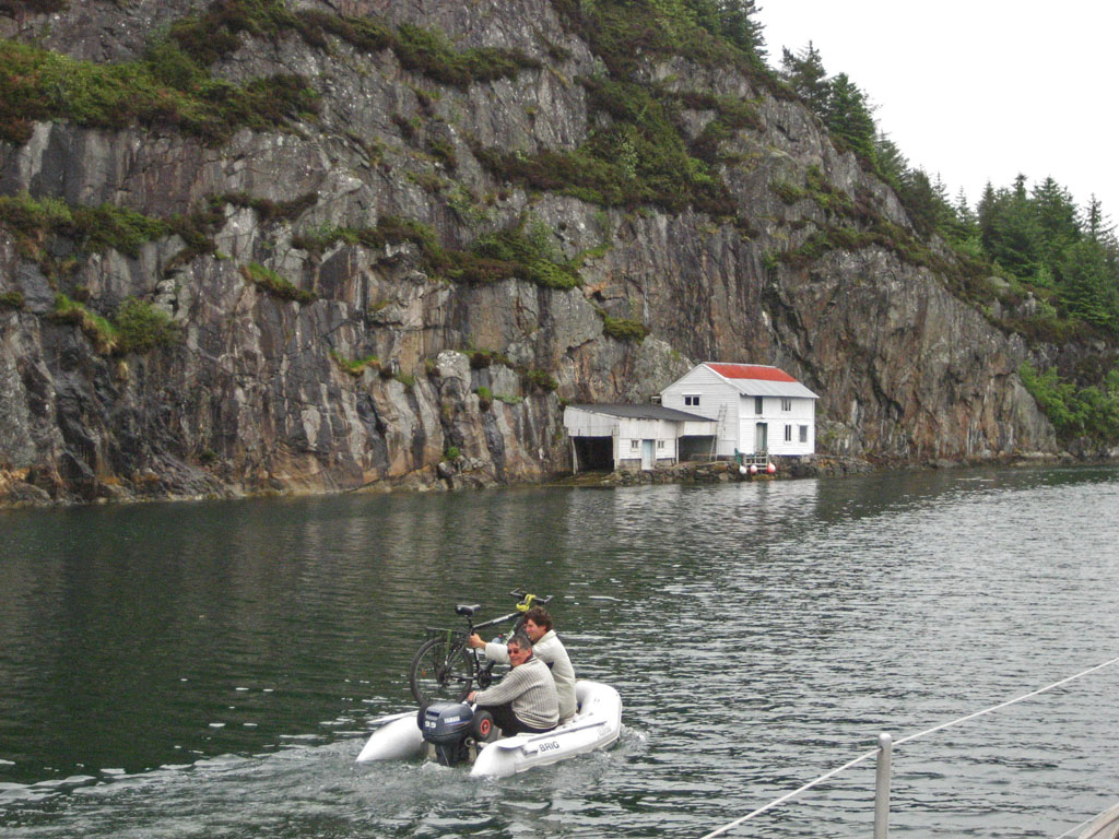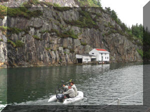 stopped for a couple of nights. We took our hitch hiker ashore, and he set off to bike across the mountains to Sweden. Notice the house and dock clinging to the cliff. There is no land access to this one (Double click any picture to see full size, then use the back button on your browser to return here) |