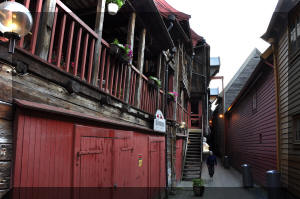 Hanseatic League for four centuries, from about 1300. About 1000 Germans lived in this ghetto of Bryggen, privileged with a monopoly of all trade in fish between Northern Norway and Europe, but prohibited from travel. They built these multi-storey wooden houses, where they lived year round with neither heat nor artificial light, due to fear of fire. The fish trade was sufficient to make them wealthy. The Norwegian fishermen were constantly indebted to the merchants and were almost slaves, catching and drying fish 700 miles to the North, in winter darkness and bringing them Bergen in spring. |