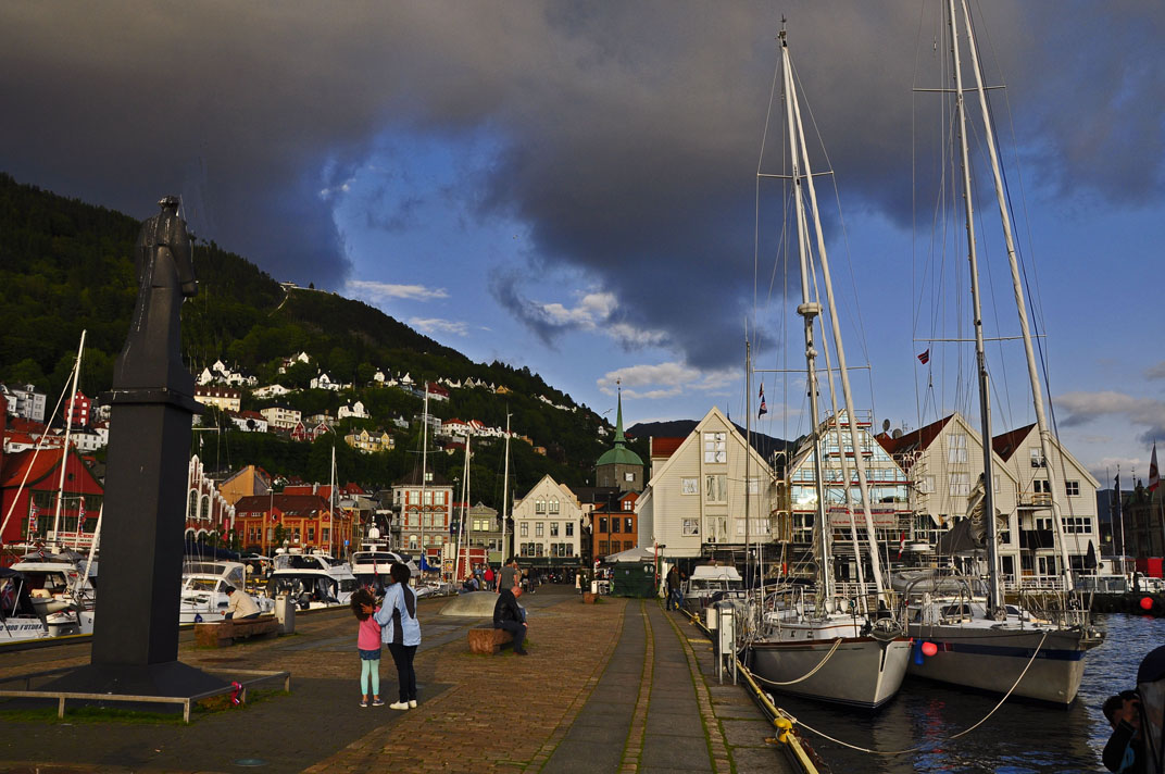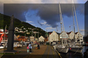 Bergen port, beside Bryggen, a UNESCO world heritage site. Bergen is reputed to be the rainiest city in Europe. but we did not do too badly, with more threatening clouds than actual rain. |