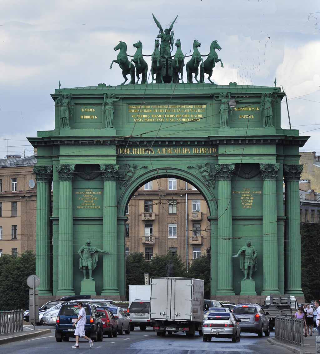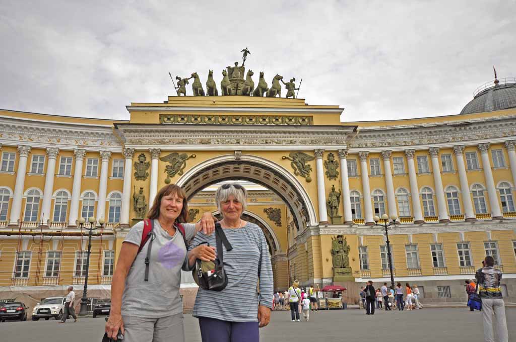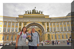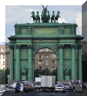 vast number of paintings, sculptures and other objects d'art. The 1917 revolution that changed the world started here. The 900-day siege of St Petersburg (then known as Leningrad) was one of the greatest battles of the Second World War, and drained the German power, setting it up for ultimate defeat. To us, the extent of restoration after the war damage and the 70 or so years of neglect that followed the demise of the Tsars was quite amazing. This rather bizarrely coloured Arc de Triomphe celebrates the defeat of Napoleon, after his disastrous campaign to take Moscow. (Double click any picture to see full size, then use the back button on your browser to return here) |