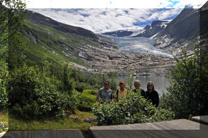 The Svartisen Glacier comes within 3 km of the sea, although it is receding like most others. We docked just below it and hiked up to the ice. Like quite a lot of the glaciers we saw, there is a lake between it and the sea, as you can see on the left. All four of us hiked up to the ice, and brought some very old ice back to celebrate crossing the Arctic Circle |