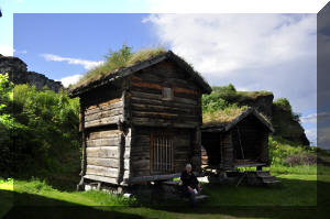 in Trondheim, where Watson and Wiz left and Dennis and Pam joined us There was a good collection of traditional Norwegian houses in Trondheim. Mostly squared-off log cabin style with sod roofs. They have a birch bark underlayer for waterproofing. Even today some new houses in Norway have sod roofs, which have some advantages with respect to insulation etc, particularly when applied over modern underlayers. |