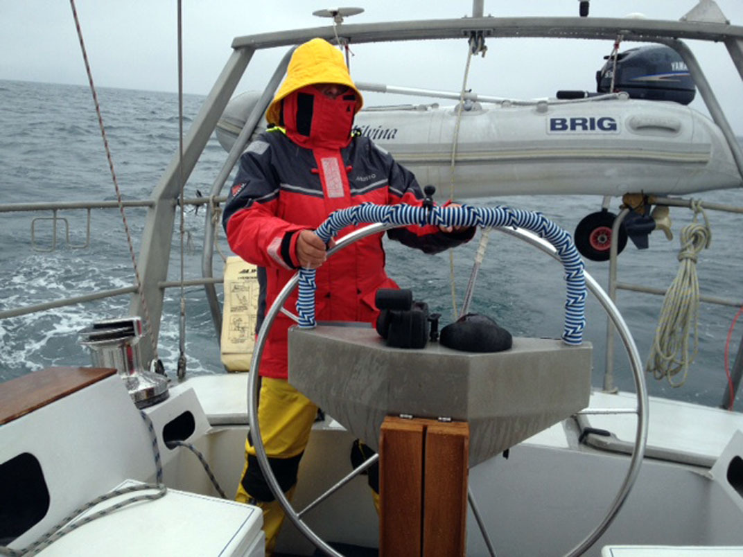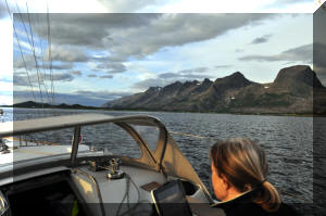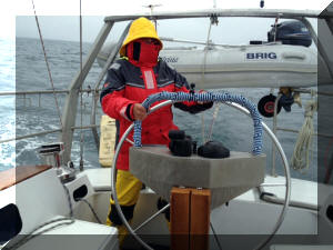 open Atlantic, the seas can be very rough even in moderate weather. We were lucky enough for Helen to be able wear her bikini as she steered around Statt, as you can see here. (Double click any picture to see full size, then use the back button on your browser to return here) |