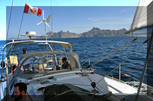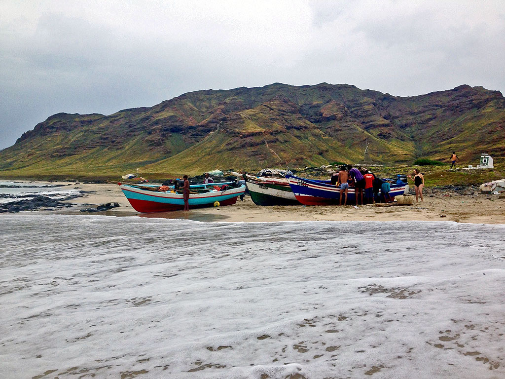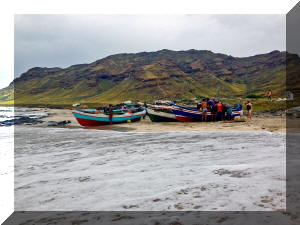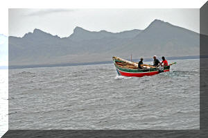 dinghy so Neil and Pam swam ashore.We met a few boatloads of fishermen who frequently spend a few days there in a rough camp, while diving for lobsters. We helped one crew drag their heavy wooden boat through the surf. They were very friendly, althoug communication was limited by our lack of skills in Portuguese. |