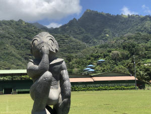 As on all the islands, there are a number of local sculptors. They work in both stone and wood. This traditional Tiki adorns the local soccer field. |