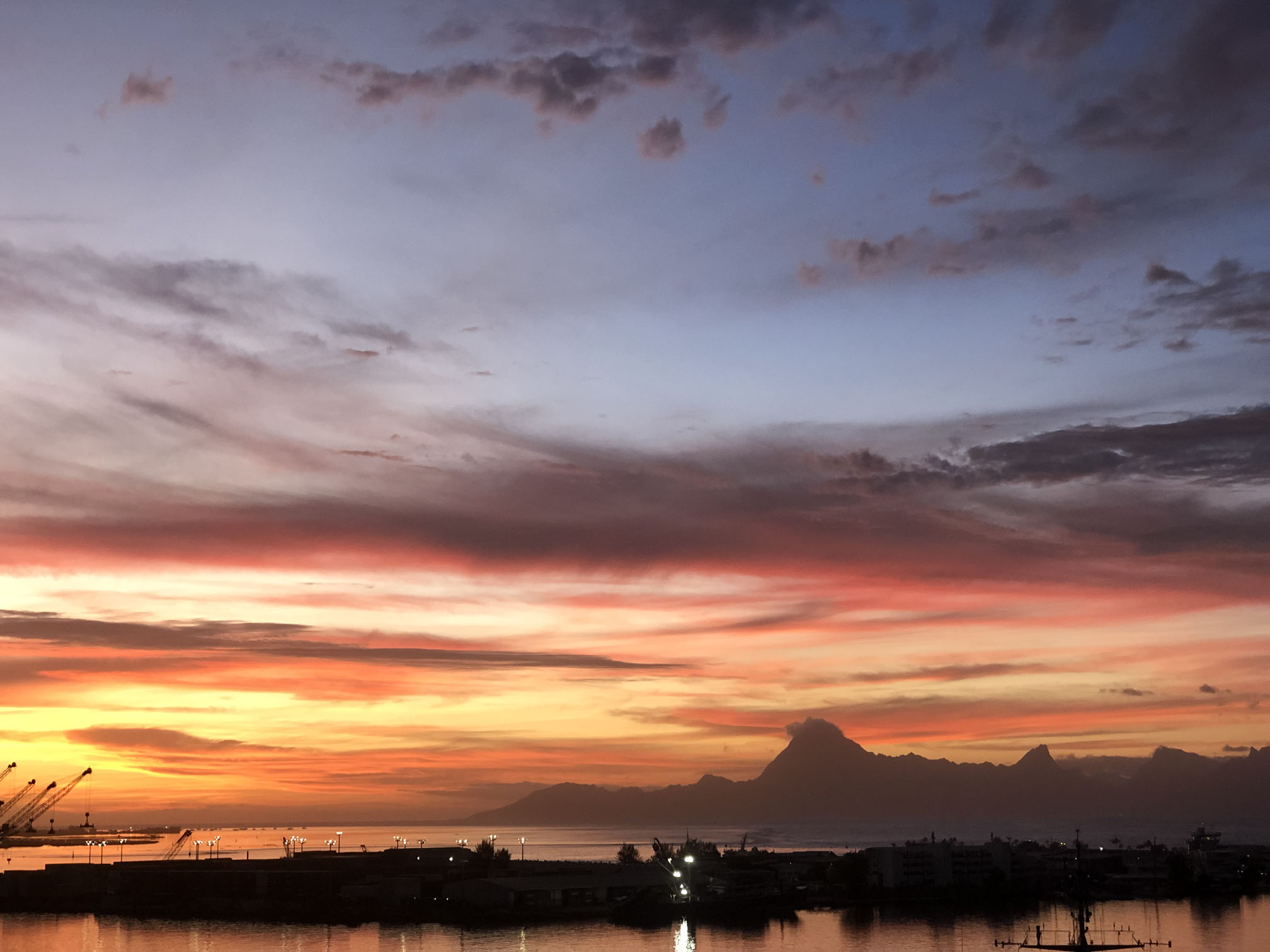 Tahiti, 700 miles away. It is radically different from the other islands, being more like a medium size town in France. Traffic, traffic lights, tons of restaurants and stores. This sunset over the neighboiring island of Moorea is from a rooftop bar in our hotel in Pape'ete. |