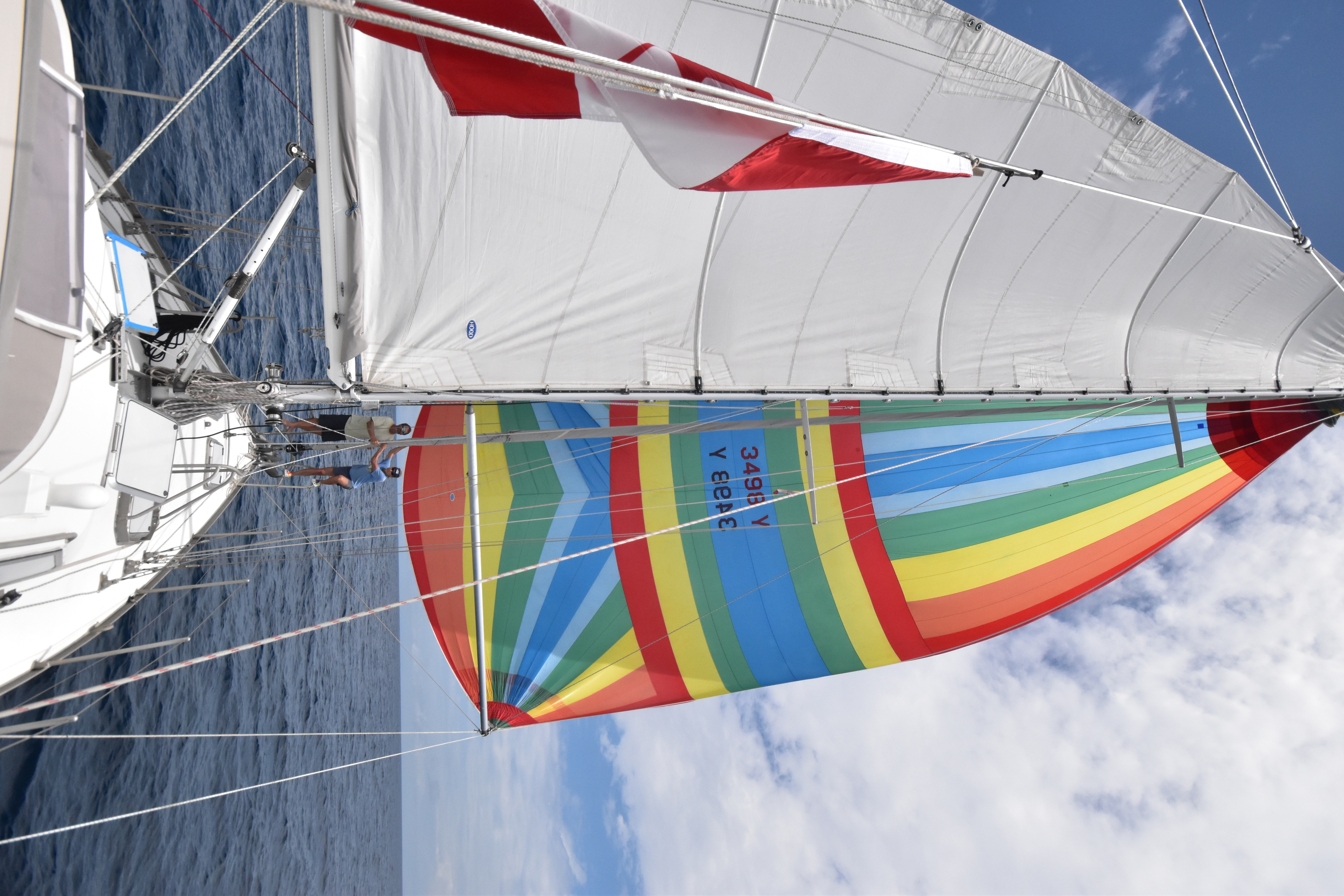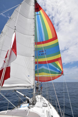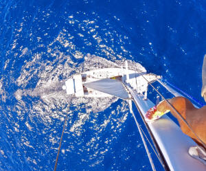 boisterously, but soon the winds were on the light side. We motored some, and took the opportunity check some masthead repair work we had done. We were busy playing with light air sails, but kept up to a 160 mile/day average only becase for a favoiurable current. |