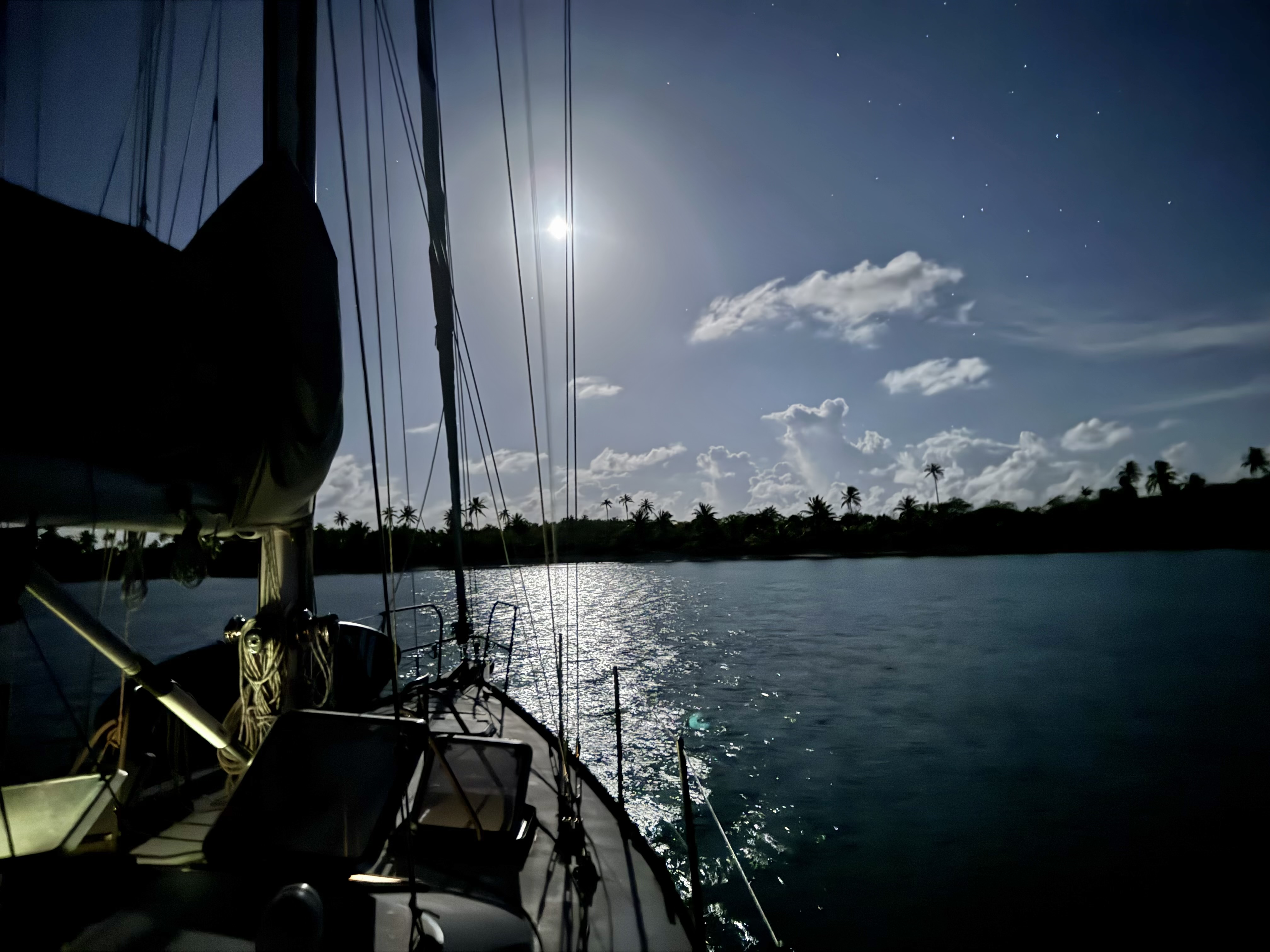 which we were perfectly located to watch. It was a total surprise, because we had not paid attention to the media. Attempts at photographing the eclipse from our moving boat were a flop, but we did have nice moonlight in the anchorage on subsequent nights. |