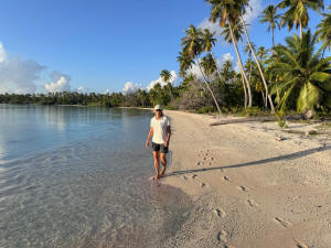 snorkeling, and of course extensive beaches on the inside. We entered by the pass in the background of the photo, and anchored beside Flora, a boat we had met previously. They are Germans who have been living on board for some time. We were both a bit frustrated to learn that they had spent the previous winter in Campbell River, within sight of our house. The anchorage is behind some shallow coral, which supports a wide variety of fish. |