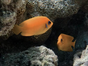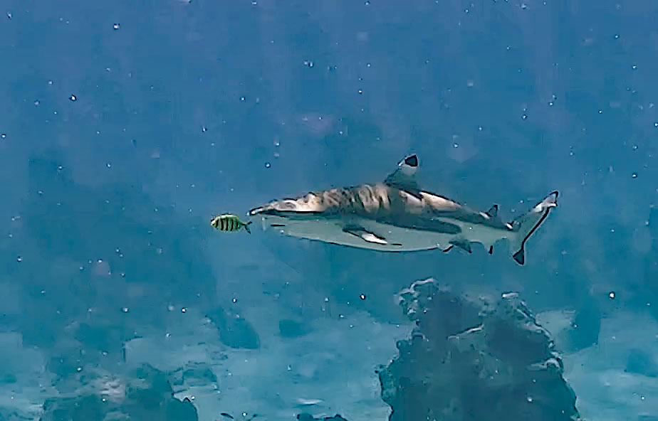 saw this shark followed the wee striped fish for several minutes.The fish seemed quite happy. |